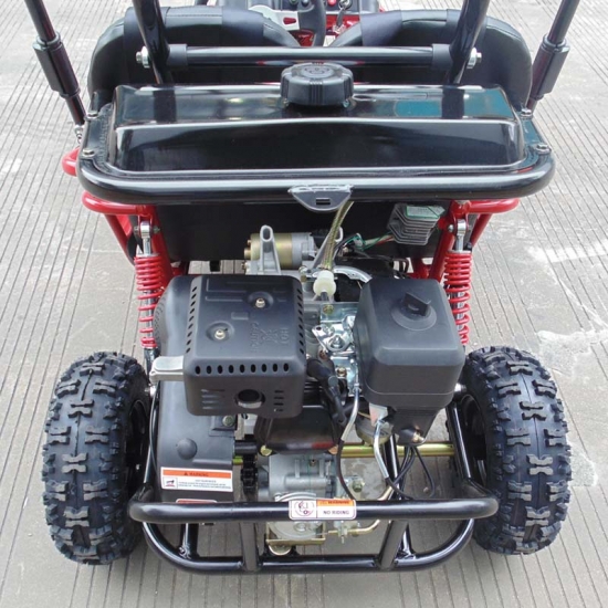 It’s a double seat, full suspension Go Kart equipped with 163cc, 5.5hp engine electric start with pull start back up and features 2-wheel drive and centrifugal clutch, simple in control with stop / go foot pedals. The Transmission is an easy to use Fully Automatic with Reverse with 5-point safety Harness.